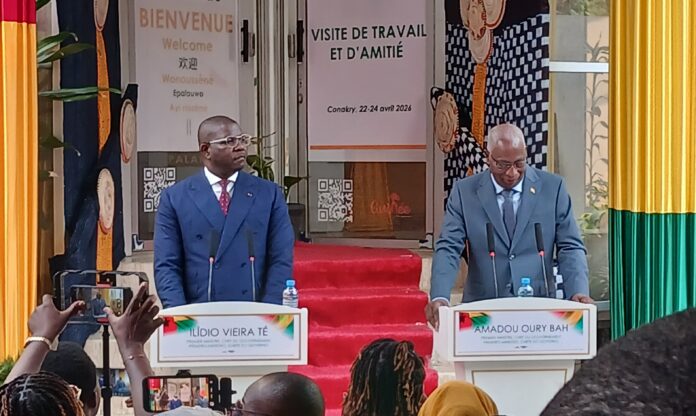 Le premier ministre bissau-guinéen Ilidio Vieira Té en visite d’amitié et de travail en Guinée, allant du 22 au 24 Avril 2026. Au cours de sa visite à Conakry le chef du gouvernement bissau guinéen a eu des séances de travail de haut niveau notamment avec le Président de la République, Mamadi Doumbouya ou plusieurs questions d’interêts ont été débattus pour le renforcement des liens de coopération entre nos deux Etats. C’est dans la perspective de ces rencontres de haut niveau qu’un point presse a eté organisé conjointement par les premiers ministres deux pays au Palais de la Colombe à Conakry.