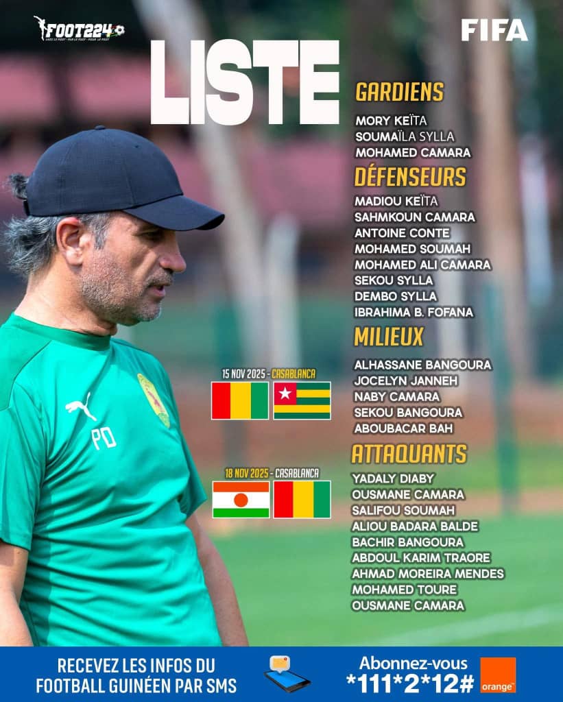 Le Syli Nationale de Guinée va livrer deux matches amicaux les 15 et 18 Novembre contre le Niger et le Togo dans le cadre de la fenêtre FIFA au Maroc.